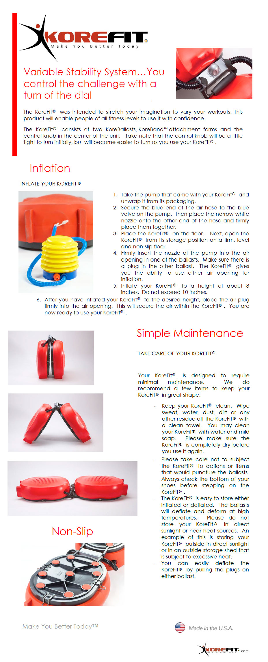KoreFit® is made in the USA of high quality materials. Every KoreFit® includes (2) KoreBands™, color coordinated exercise cards, instruction sheets and air pump.